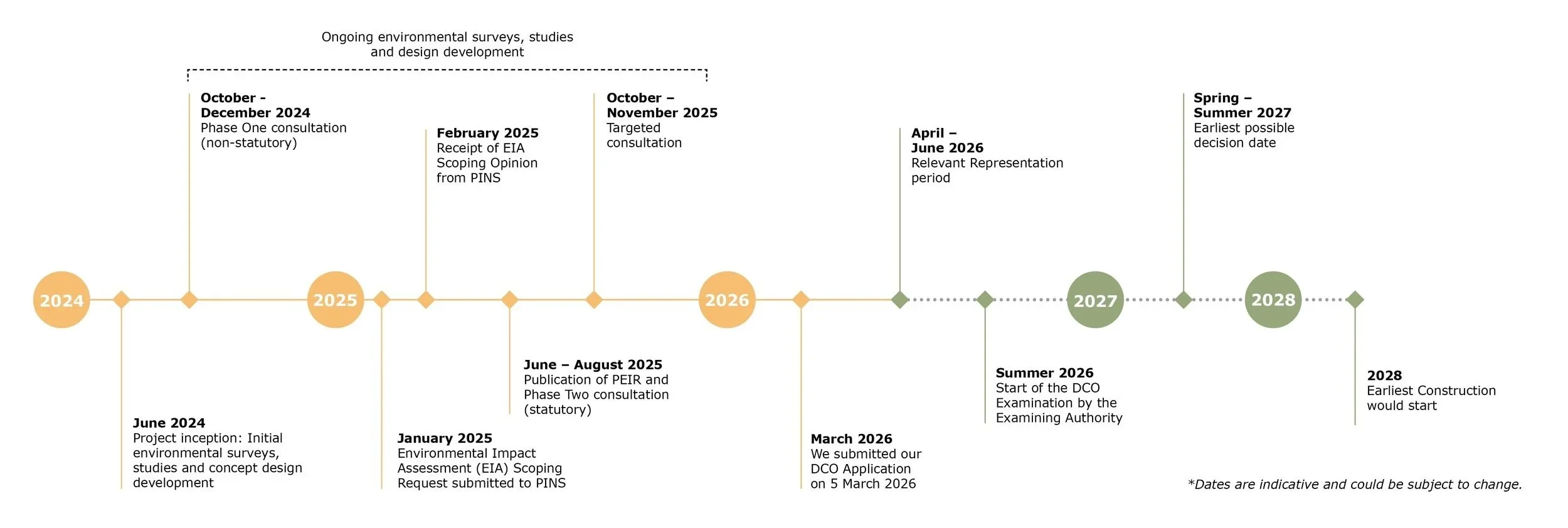 We anticipate the development process through DCO submission and examination will take between two to three years. We submitted our DCO application to PINS, who will administer the application on behalf of the Secretary of State, in March 2026. Subject to achieving consent, construction would start no earlier than 2028.